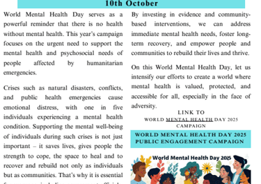 The theme reminds us that mental health is a shared responsibility — not limited to one day, but nurtured through everyday conversations, compassion, and care.